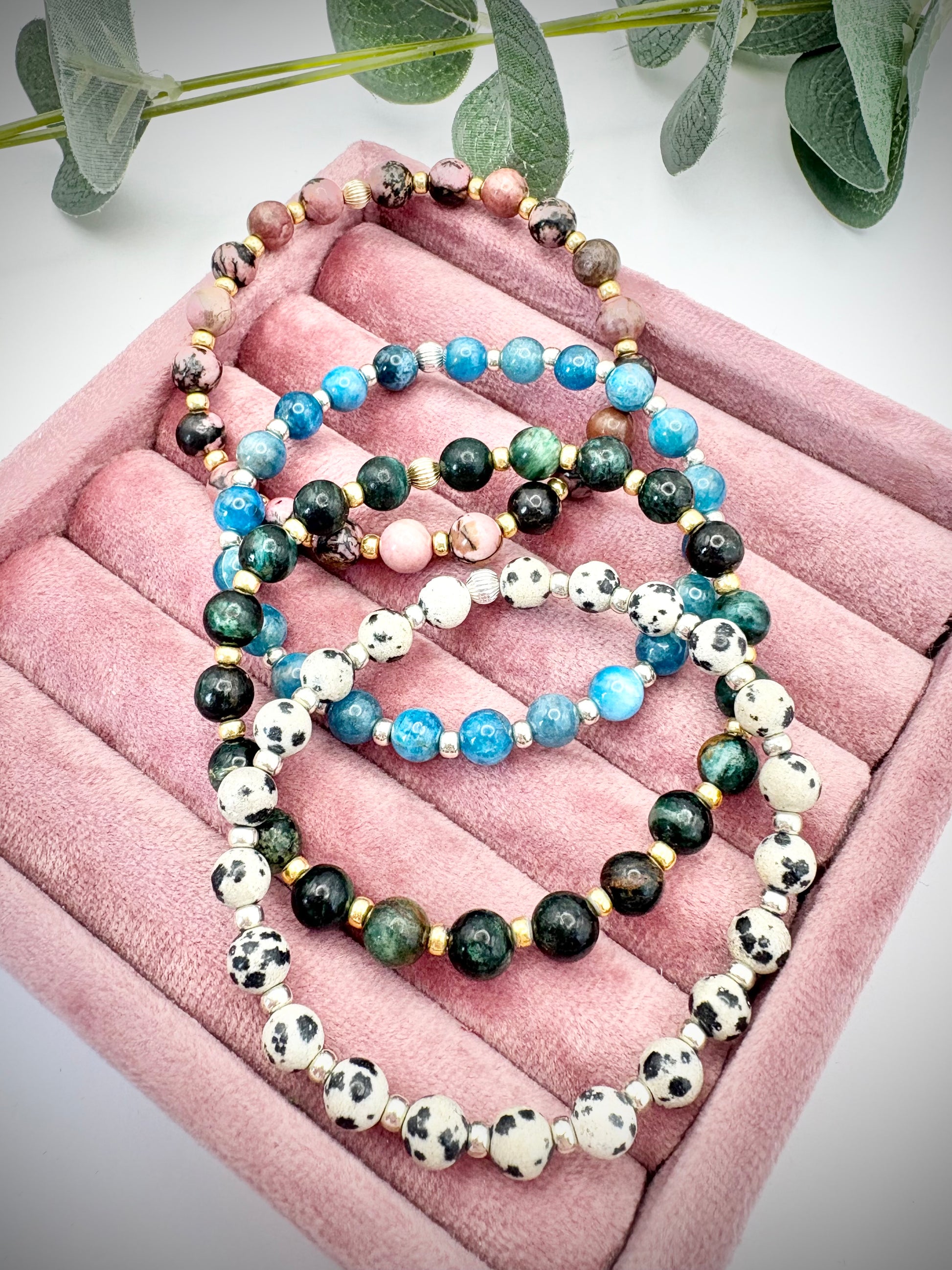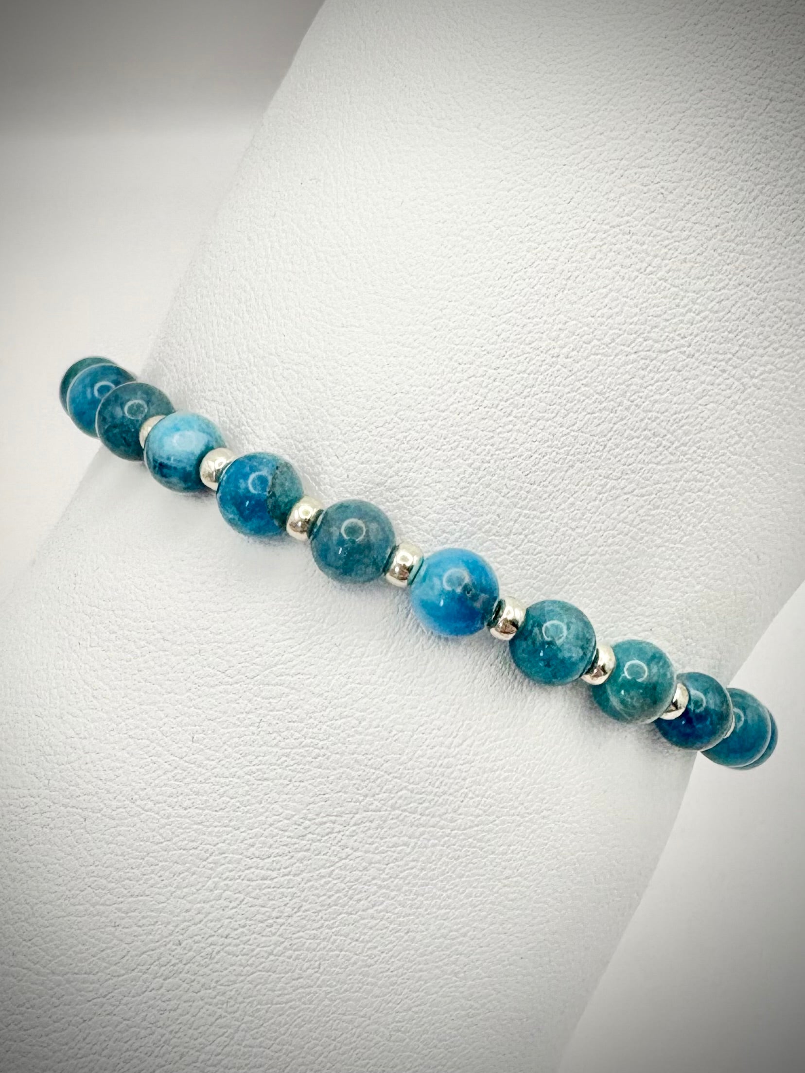 • Made with 6mm natural apatite beads, paired with silver Miyuki seed beads, which are coated to retain the colour for longer
