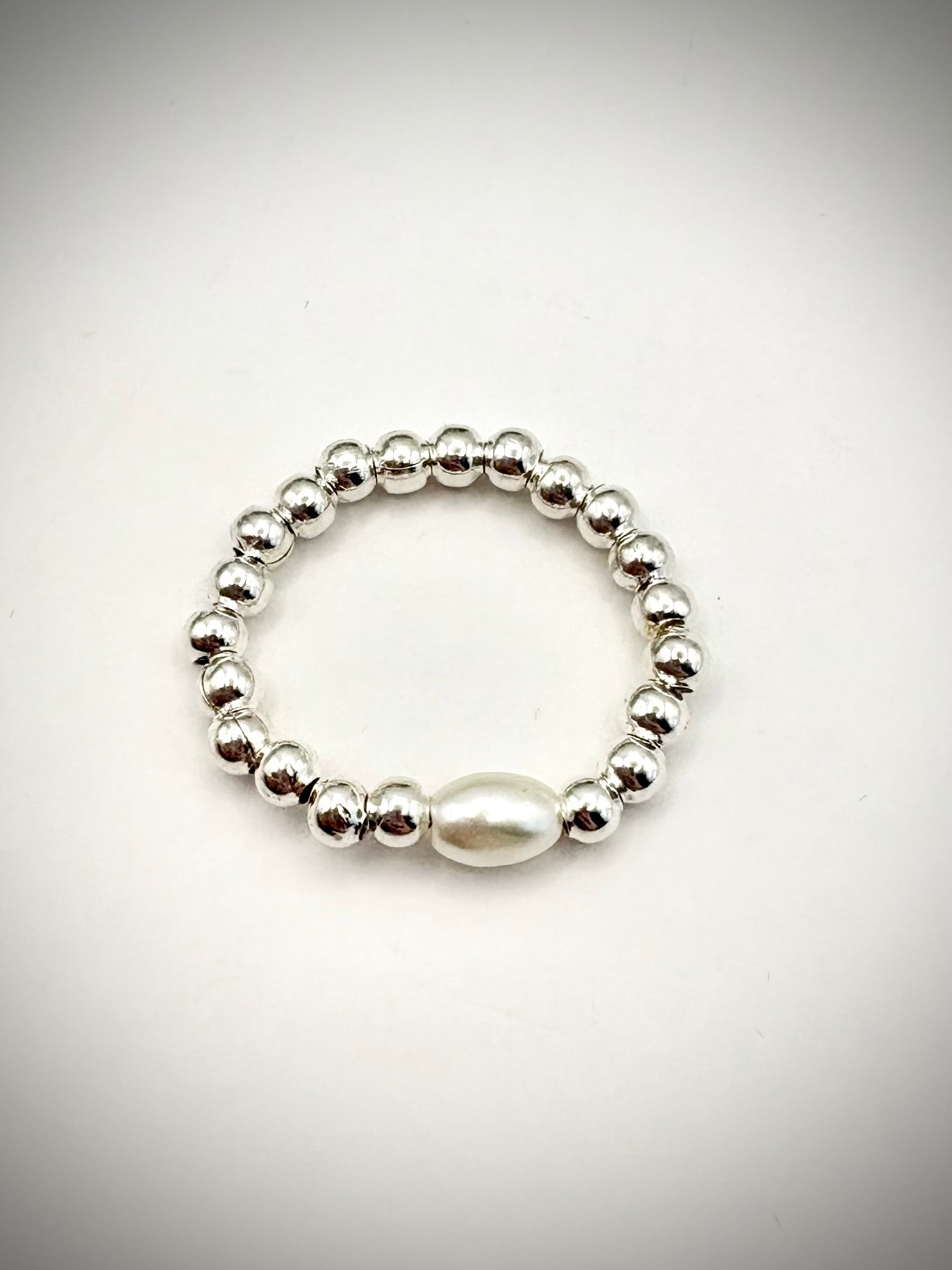 Hand-strung with gold or silver-plated beads, and featuring a central glass pearl bead, this dainty stretchy ring is designed to be fun yet comfy.