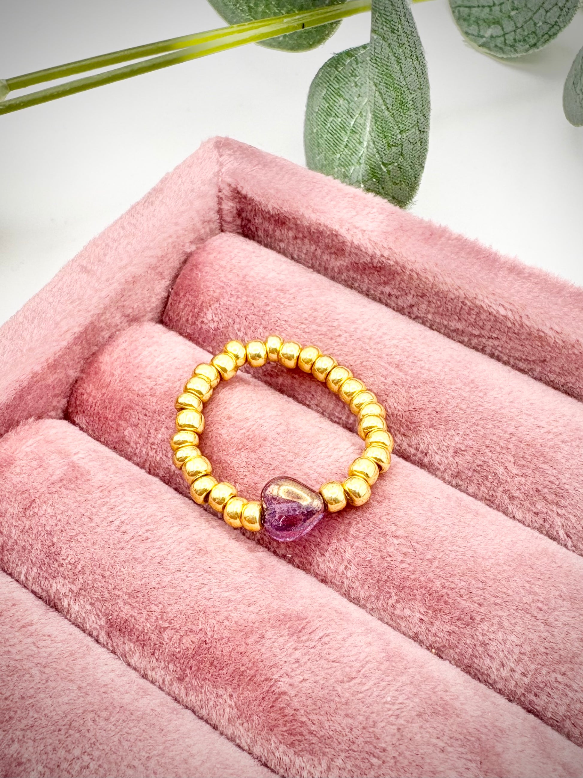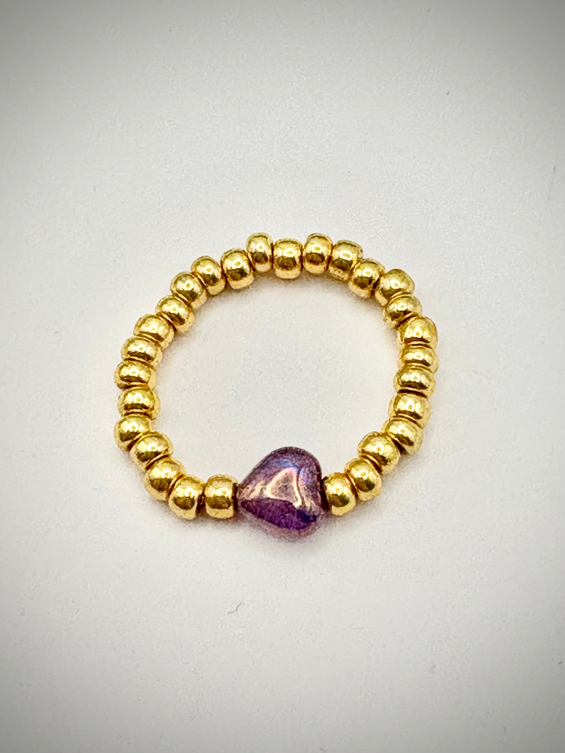 Hand-strung with gold Japanese Miyuki seed beads, and featuring a centralised Czech glass heart bead, this dainty stretchy ring is designed to be stylish yet comfy.