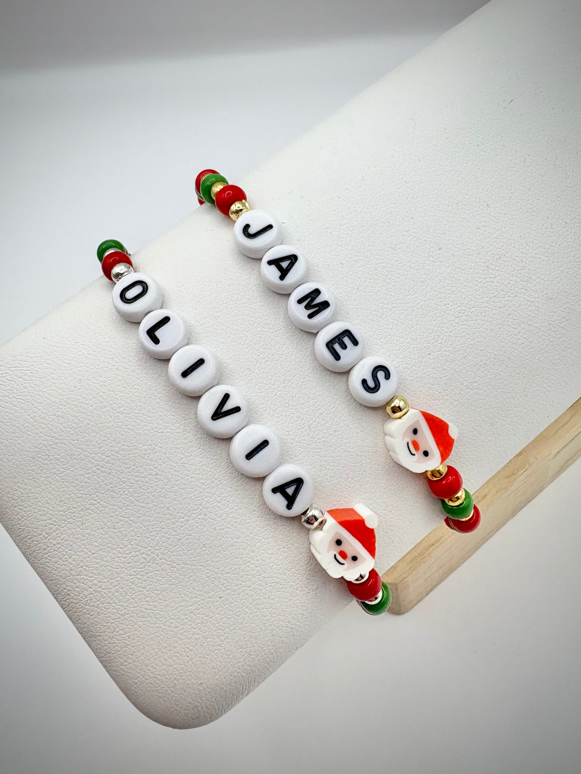 A handmade personalised beaded bracelet with Santa polymer clay bead and name of your choice. The perfect little stocking filler!