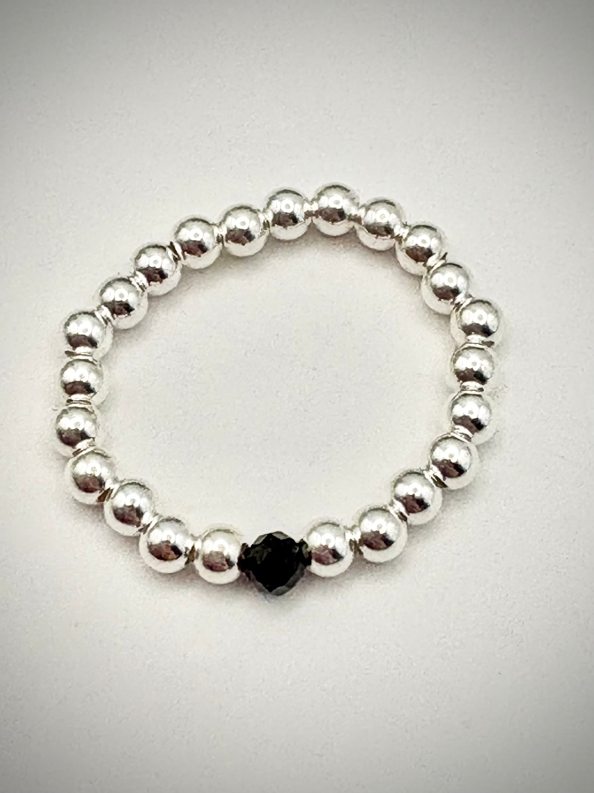 Luxe 925 Sterling Silver 3mm Beaded Stretch Ring With Black Tourmaline - Perfect For Stacking