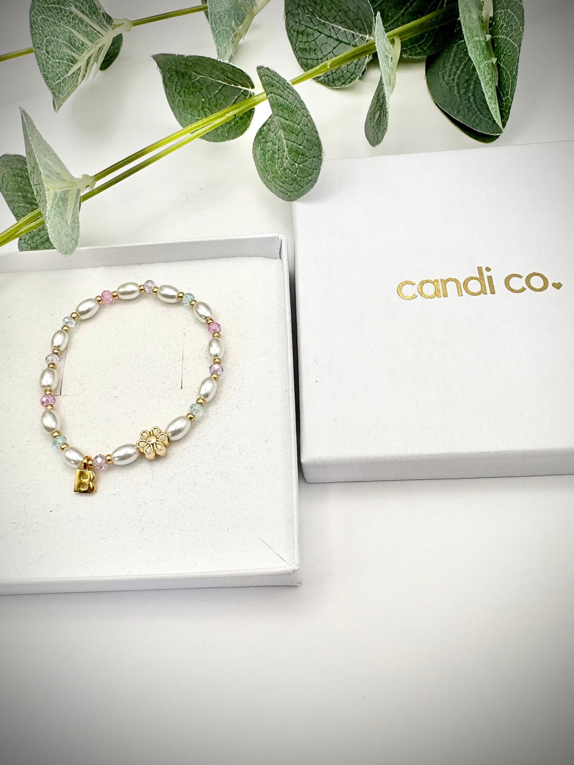 Personalised Glass Pearl & Crystal Flower Girl Bracelet Kids - Gold