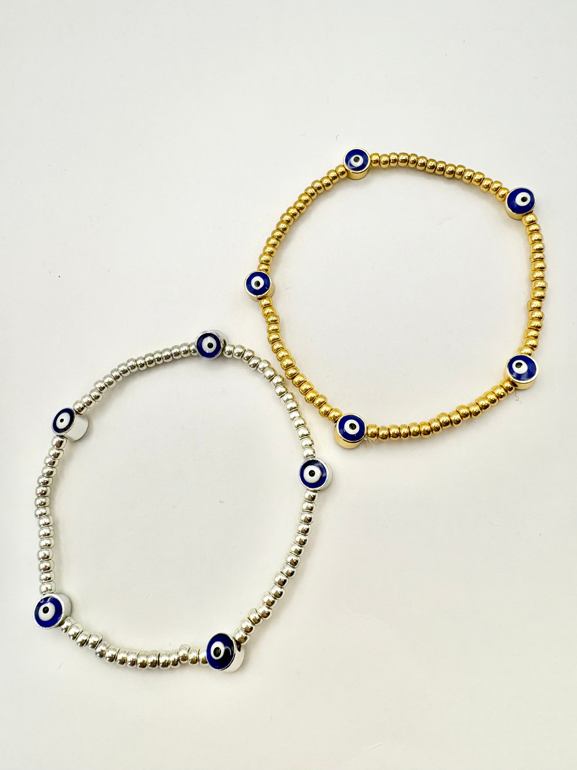 Gold or silver seed beads with evil eye charms, size 7" (approx medium).