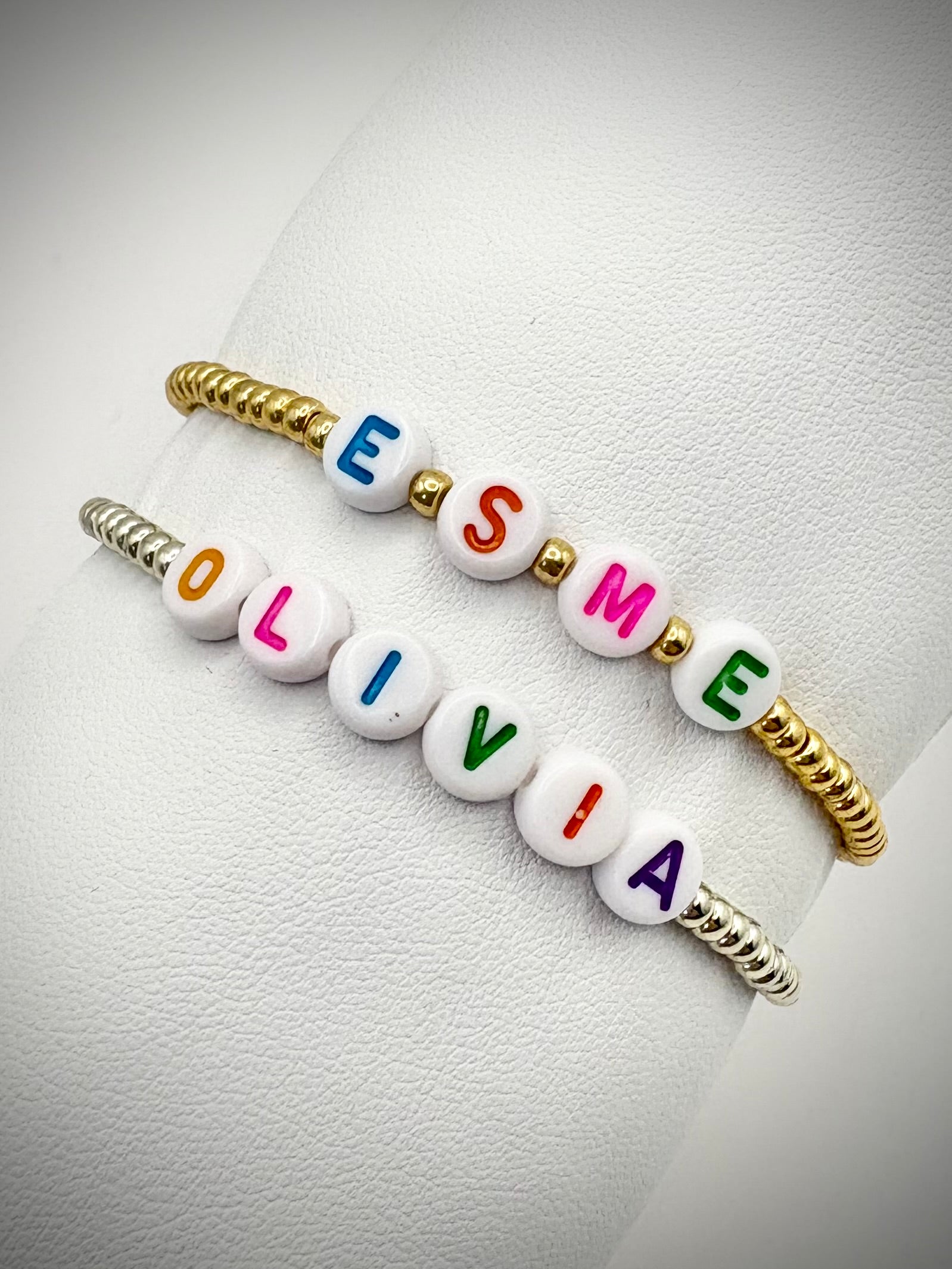 This handmade bracelet is made with Japanese Miyuki seed beads - in either gold or silver - and features colourful alphabet beads to make it personal. Perfect for kids or grown-ups! Lightweight and fun, they’re perfect for stacking or wearing solo.