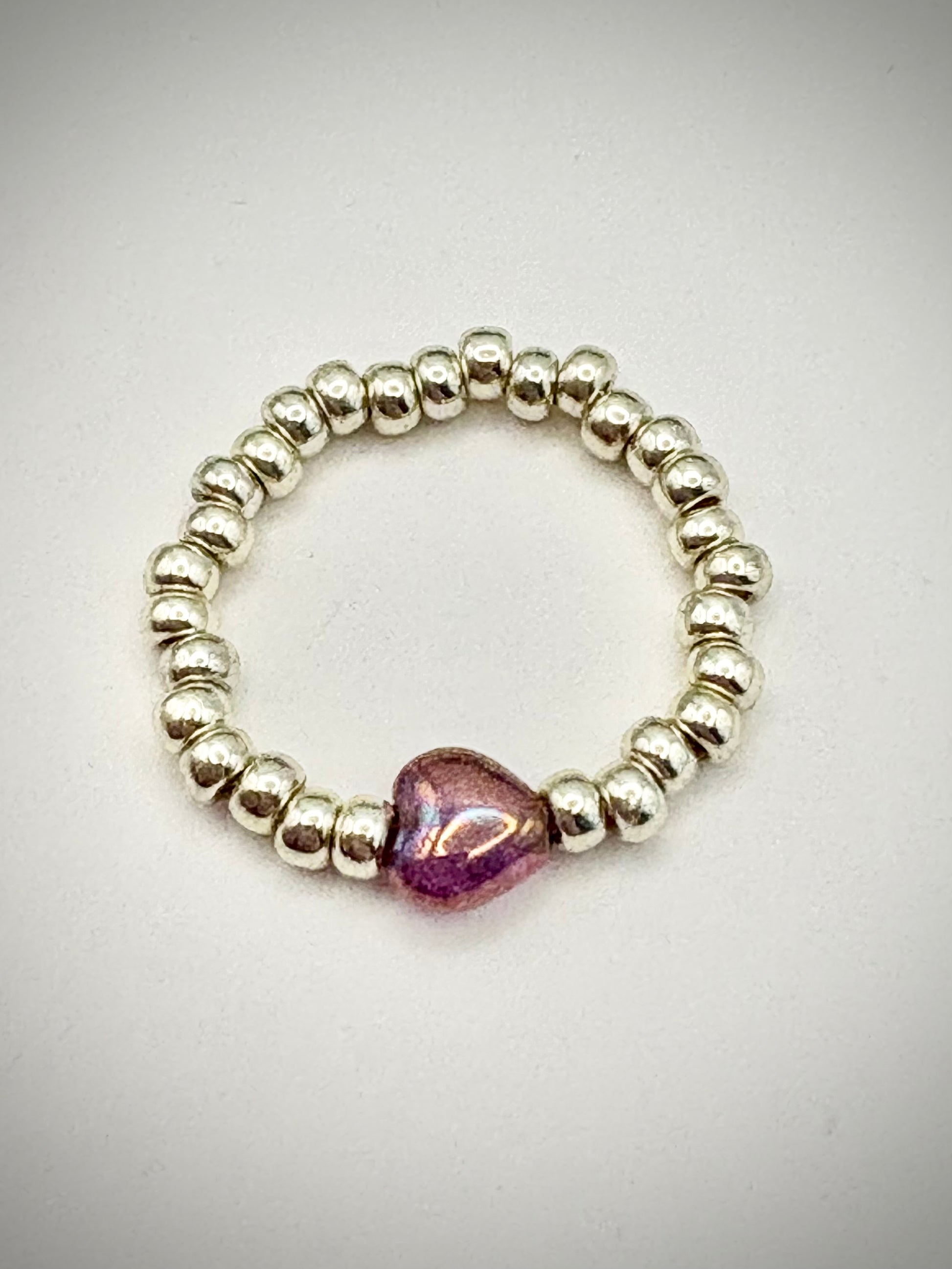 Silver 3mm Seed Beaded Stretch Ring with Czech Glass Heart Bead - Perfect For Stacking