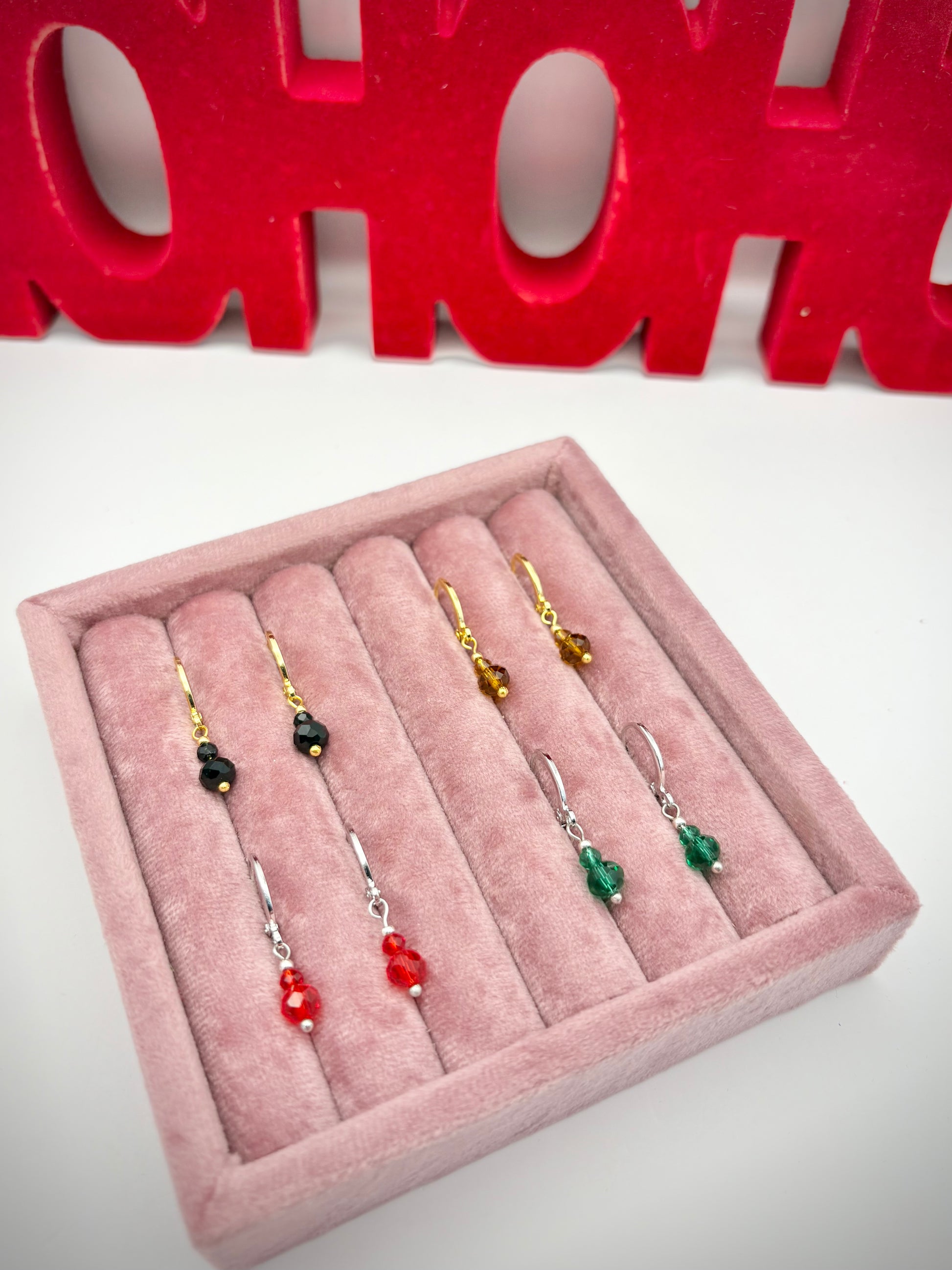 Festive hoop earrings with a sparkly crystal charm in red, black, green or brown. Lightweight and easy to wear, they’re a perfect addition to your Christmas outfit or gifting as a stocking filler.