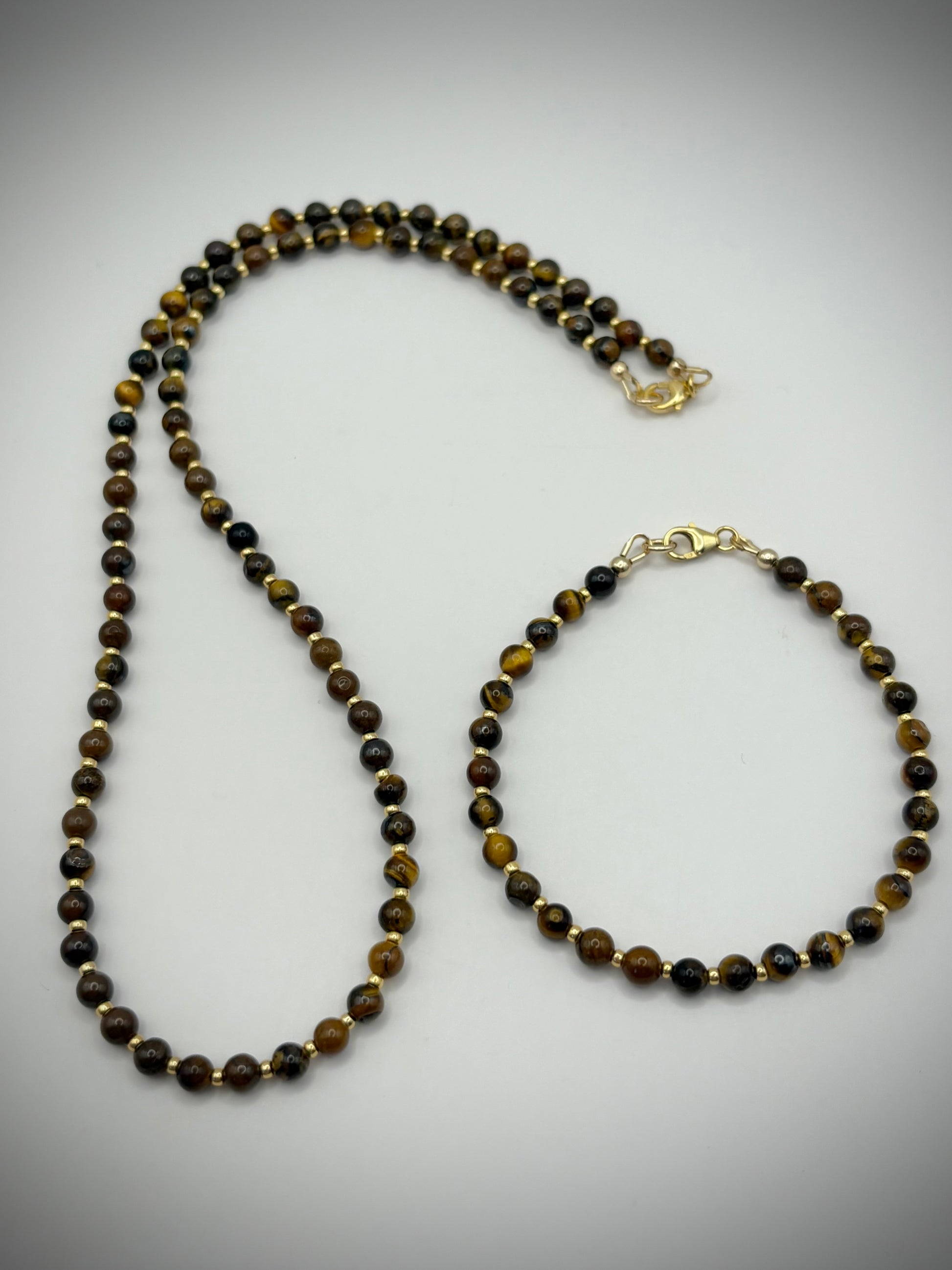 A bold yet earthy piece designed to ground and empower. This handcrafted bracelet features rich golden-brown tiger’s eye gemstones and delicate gold seed beads - perfect for adding a touch of strength and style to your everyday look. Matching necklace available